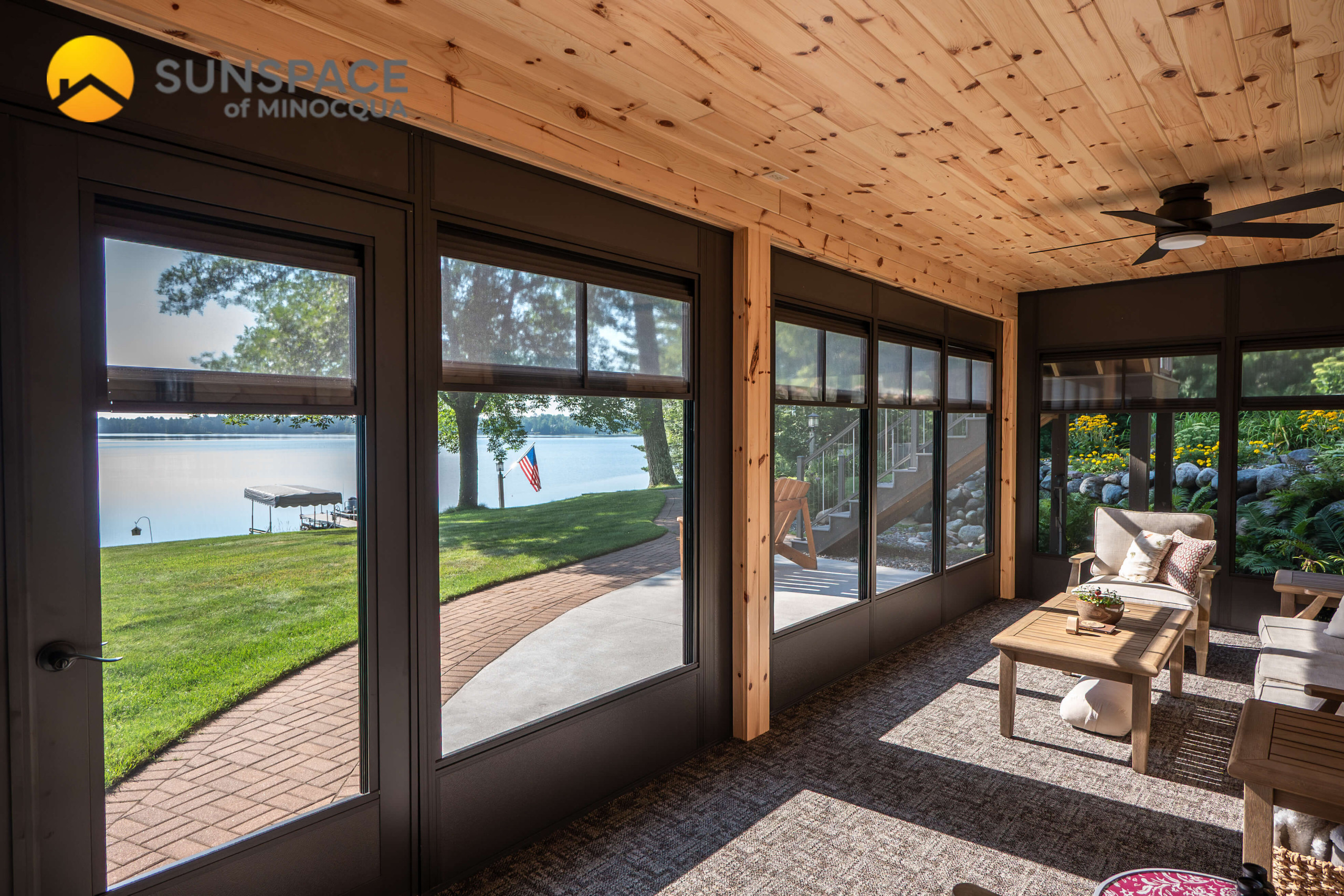 Sunspace Walls Under Existing Roof offer superior comfort and protection by blocking pests and wind while allowing natural light to brighten the space. Combined with WeatherMaster windows, homeowners get a safe, stylish, and virtually maintenance-free solution that enhances both function and beauty. Homeowners enjoy a durable upgrade that extends the life of their outdoor living area, reduces seasonal cleaning, and creates a versatile space for entertaining or relaxing by the lake.